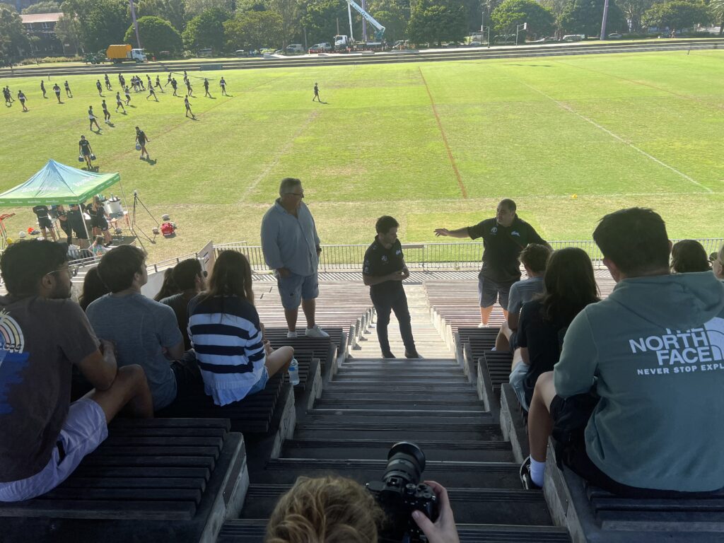 A large group of students from Sydney Uni were in the grandstand with their lecturer who was wearing his Souths jersey. Shannon Donato, Brock Schaefer and Mark Ellison all had a chat to the assembled youngsters.